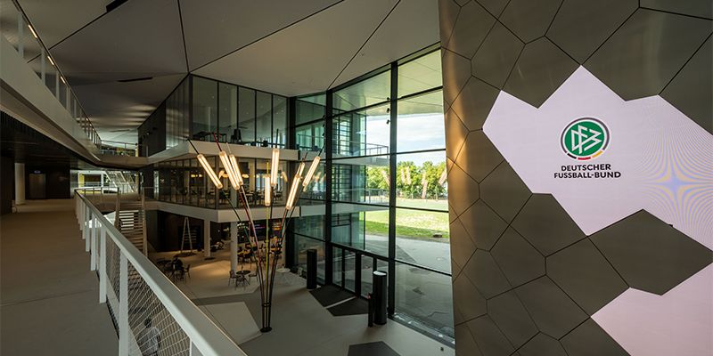 Nach mehr als neun Jahren wurde am 30. Juni 2022 der neue DFB-Campus auf dem Gelände der ehemaligen Galopprennbahn in Frankfurt-Niederrad feierlich eröffnet. Als Zentrale und Akademie vereint der Fußballbund hier auf rund 15 Hektar Gesamtfläche die verschiedenen Verwaltungseinheiten mit Seminar-, Konferenz-, und Trainingseinrichtungen. In weniger als zwei Jahren ist es gelungen, ein vierstöckiges Gebäude mit etwa 57.000 m² Bruttogeschossfläche, eine Fußballhalle, eine Mehrzweckhalle, einen Fitnessbereich, 40 Konferenz- und Seminarräume, Büroräume für aktuell rund 500 Mitarbeitende sowie ein Athletenhaus mit 33 Zimmern fertigzustellen.